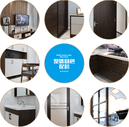同色配套是指:新房裝修所需的衣柜,柜門,櫥柜,房間木門,衛(wèi)生間鋁門廚房隔斷門及浴室柜和裝飾墻板這八類核心產(chǎn)品在款式,比例,風(fēng)格,質(zhì)感色彩等方面高度協(xié)同,整體融合,體現(xiàn)出格調(diào)一致的超強(qiáng)設(shè)計(jì)感!讓家裝提高兩個(gè)檔次!